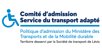 Toutes les décisions portant sur l’admissibilité d’une personne au service de transport adapté sont basées sur les critères établis par le ministère des Transports et de la Mobilité durable (MTMD)  qui est disponible sur le site Web du ministère. Le rôle de la Société de transport de Lévis consiste à accueillir, documenter et déposer au comité d’admission les demandes reçues et à offrir le service de transport aux personnes admises, le cas échéant.
