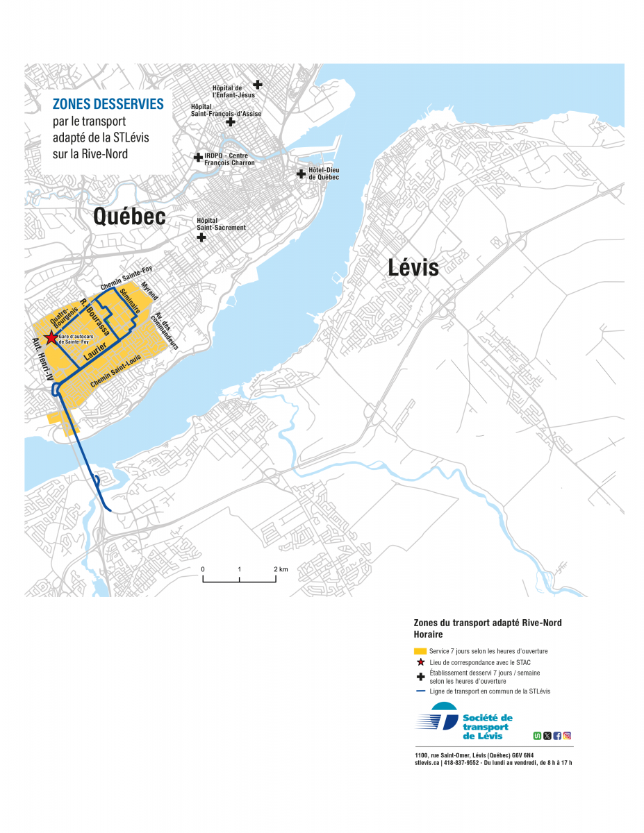 Dans ce cas, le déplacement sera pris en charge par la STLévis et le STAC sur leurs territoires respectifs et comprendra un changement de véhicule à la gare d’autocars de Sainte-Foy ou à tout autre lieu, à la discrétion des organismes de transport adapté concernés.